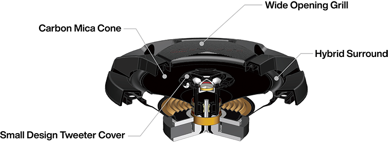Newly developed small cover significantly reduces areas that interfere with the woofer cone. High-quality sound is assured.